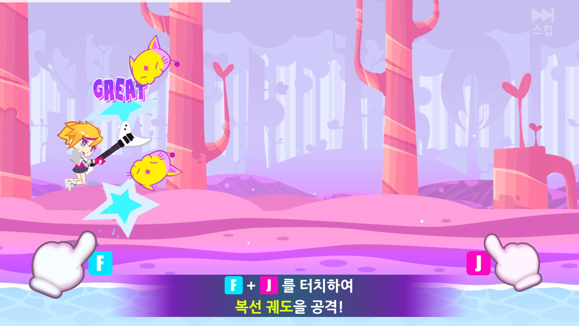 기존 리듬 게임에서 보다 쉽게 느껴졌던 것은 첫째는 2개의 키만으로 조작이 가능하다는 점! 두번째는 액션 게임 형태의 디스플레이 연출에 있는 것 같습니다.