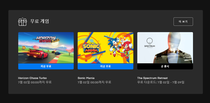 에픽게임즈 홈페이지(https://www.epicgames.com/store/ko/)에 접속합니다. 로그인(회원가입)을 완료한 후, 스토어에서 스크롤을 내려 무료게임 부분에서 지금무료 2종(Sonic Mania, Horizon Chase Turbo)를 0원 결제 하시면 됩니다.