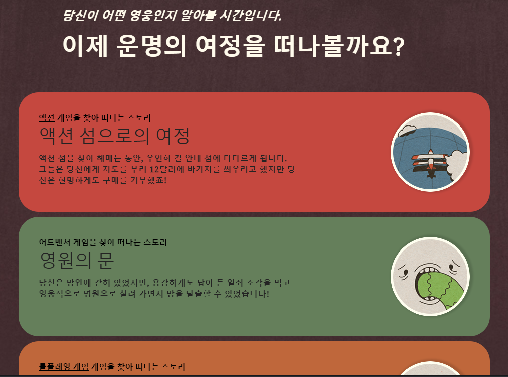 이번 여름세일의 컨텐츠는 각 장르마다 전개되는 스토리를 읽고, 자신의 성향에 맞는 선택지 중 하나를 선택하면 스팀채팅 등에서 사용 가능한 스티커를 받을 수 있습니다.