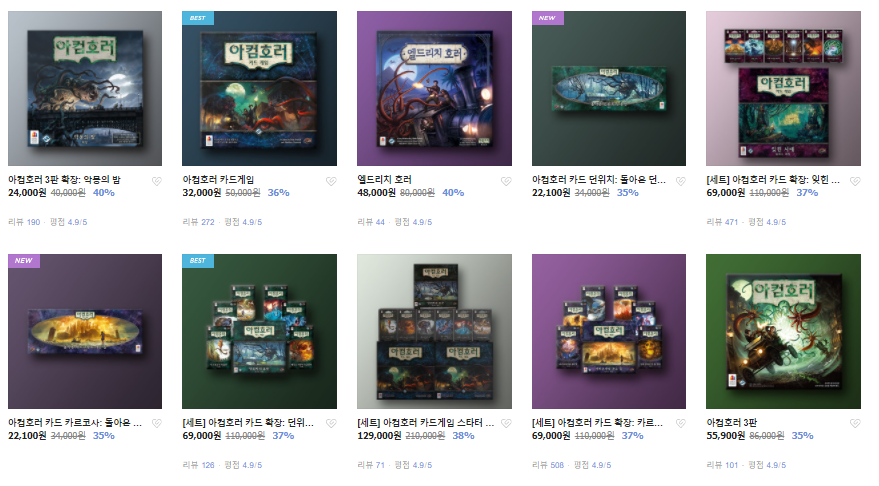 | [세트] 아컴호러 카드게임 스타터 세트 | ₩210,000 | ₩129,000 | 38.6% |