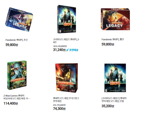 쿠팡에서 기존 팬데믹 혹은 팬데믹 레거시를 코리아보드게임즈 공식 마켓 다이브다이스에서 보다 훨씬 저렴하게 구매할 수 있습니다. 본판과 레거시만 한글판이니 참고하세요.