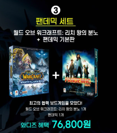 세번째 구성은 기본 구성에 팬데믹 기본판을 포함한 버전 입니다. 76,800원 입니다. 기존 팬데믹이 30% 할인가 34,300원에 판매되는 것을 감안하면 월드 오브 워크래프트 : 리치왕의 분노 보드게임을 비슷한 가격에 구매하는 것이 되는 것이라 상당히 가성비가 좋은 구성 입니다.