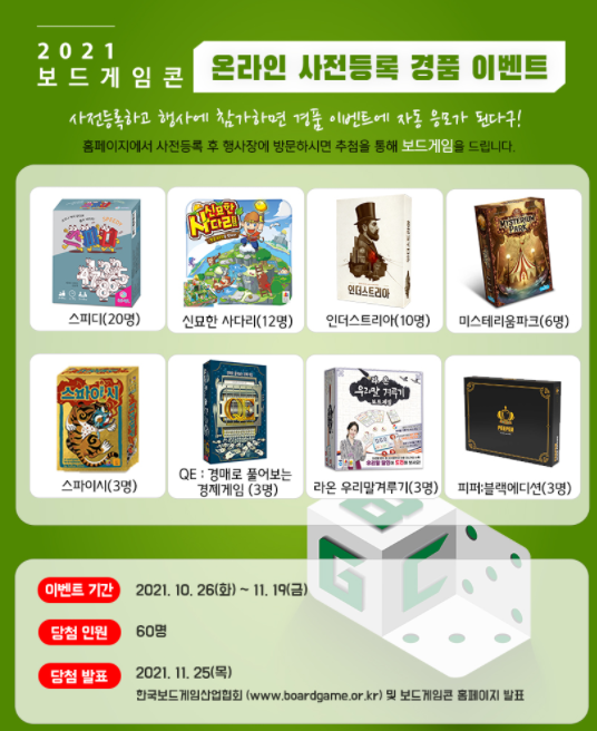업체 참가등록은 마감된 상태이며, 개인 관람 참가비는 무료이며 11월 19일(금)까지 사전예약을 받습니다. 온라인 사전등록 경품 이벤트로 사전등록 후 행사장방문시 총 60명에게 추첨을 통해 다양한 보드게임을 드린다고 합니다.
