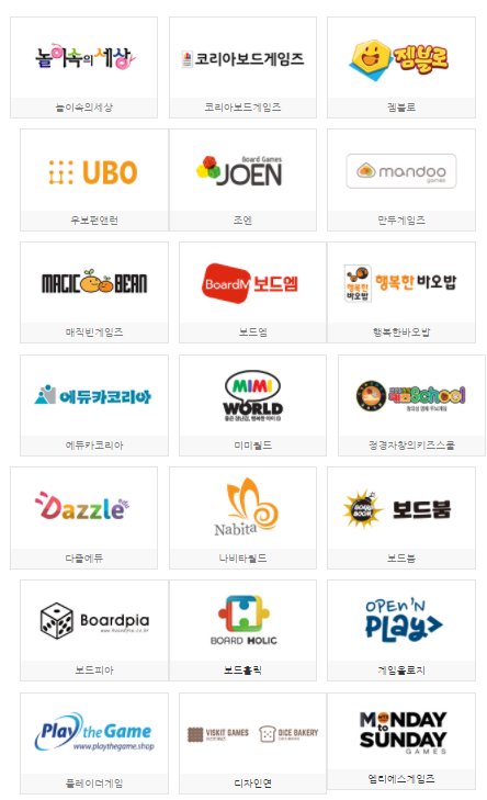 참여업체들은 놀이속의세상, 코리아보드게임즈, 젬블로, 우포런앤런, 조엔, 만두게임즈, 매직빈게임즈, 보드엠, 행복한바오밥, 에듀카코리아, 미미월드, 정경자창의키즈스쿨, 다즐에듀, 나비타월드, 보드붐, 보드피아, 보드홀릭, 게임올로지, 플레이더게임, 디자인연, 엠티에스게임즈 총 21개 업체입니다.